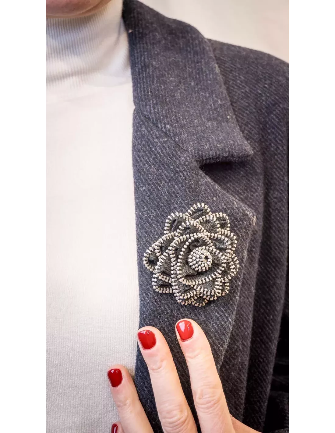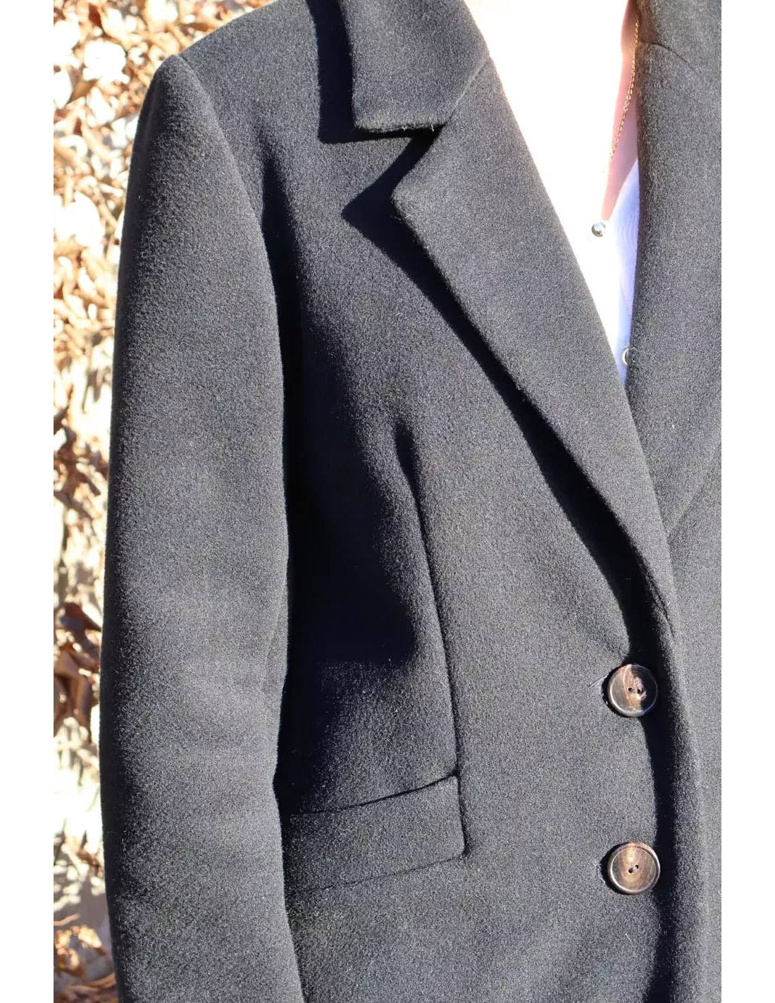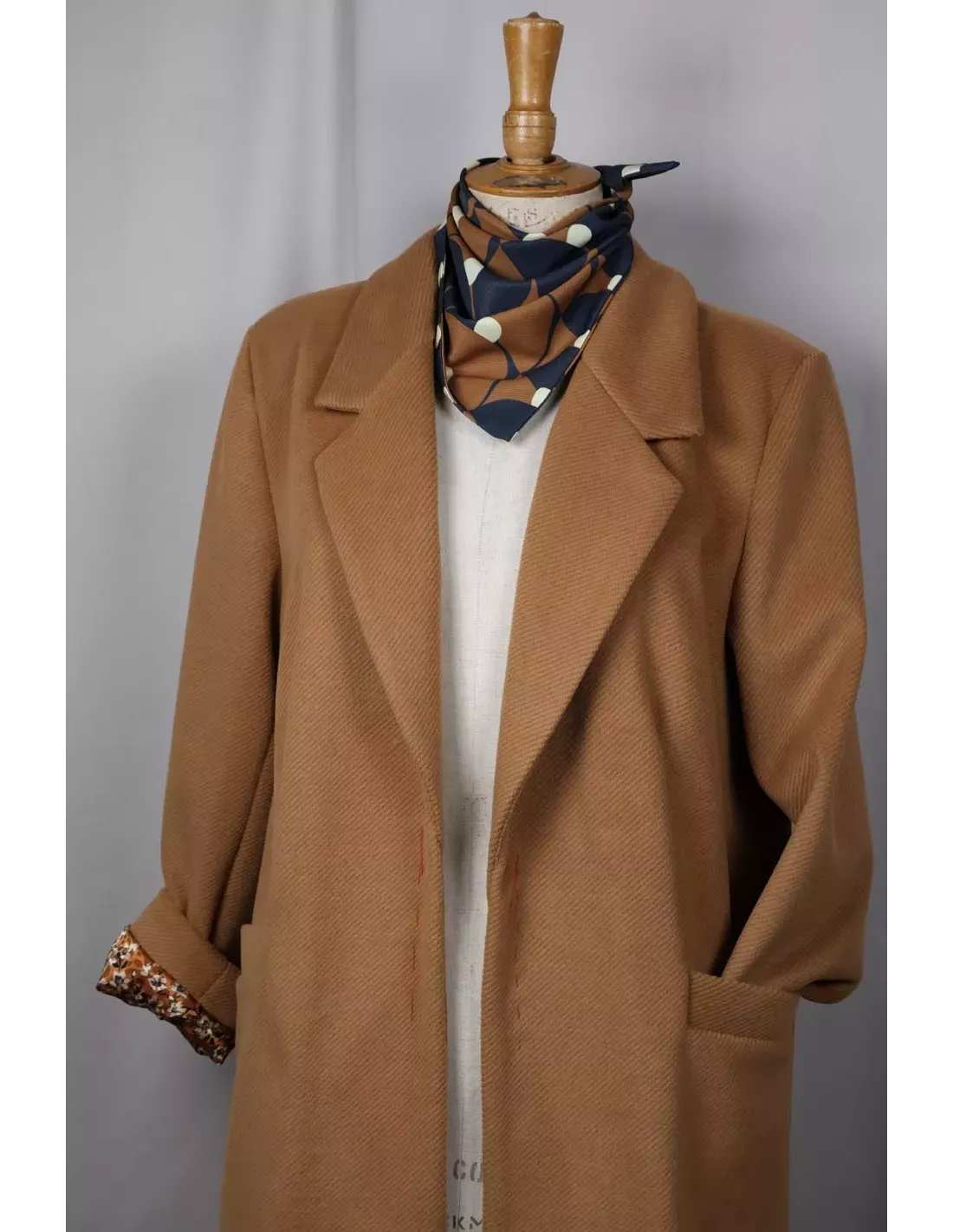Il propose une manche tailleur, un col tailleur et une découpe partant de l’épaule pour rejoindre la couture de coté, dans laquelle vient s’insérer une poche à rabat.